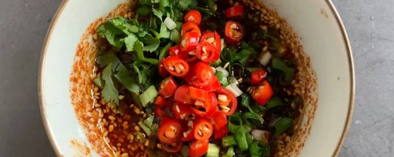 准备食材,大蒜、小米辣、香菜。食材切碎放入小碗,倒入香醋、酱油、蚝油、香油、糖,醋和酱油的比例按照个人口味调整。锅烧热,放少许花椒,倒入食用油,小锅煎出花椒香味。最后浇在碗中即可。