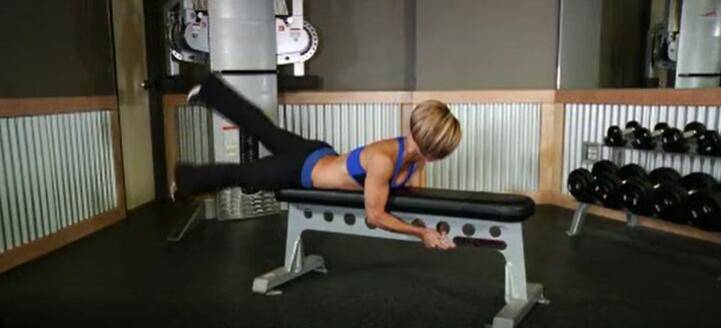 1、俯卧躺在平坦的长椅上,臀部放在长椅的末端,腿伸直,脚尖远离地面,手臂扶住长椅的顶端。