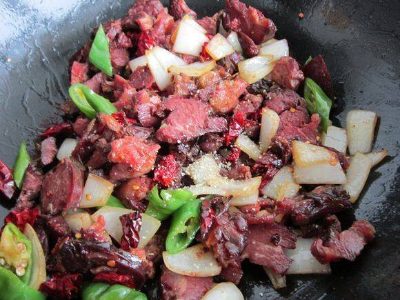 6、热锅凉油加花椒粒辣皮子小火炒出香味。