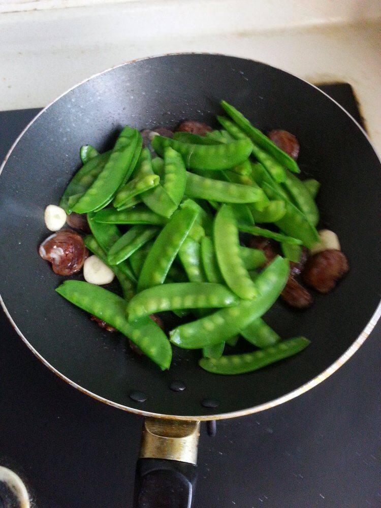 2、荷兰豆下水焯一下,放点盐能保持绿色更鲜艳。