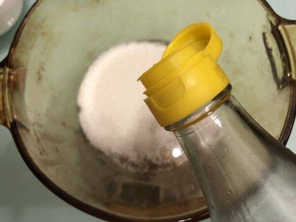 6、准备糖醋汁,取一个锅加入一半的白醋和糖加热至融化后关火,再加入另一半白醋,等彻底冷却。