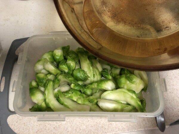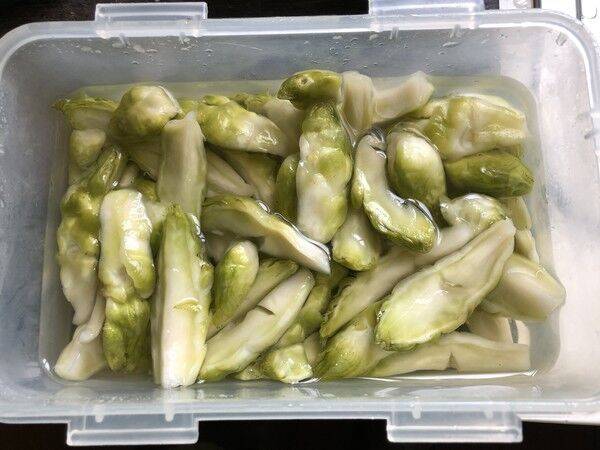 10、腌制了3天后,儿菜的颜色由原来的翠绿变成黄绿色,即可食用。