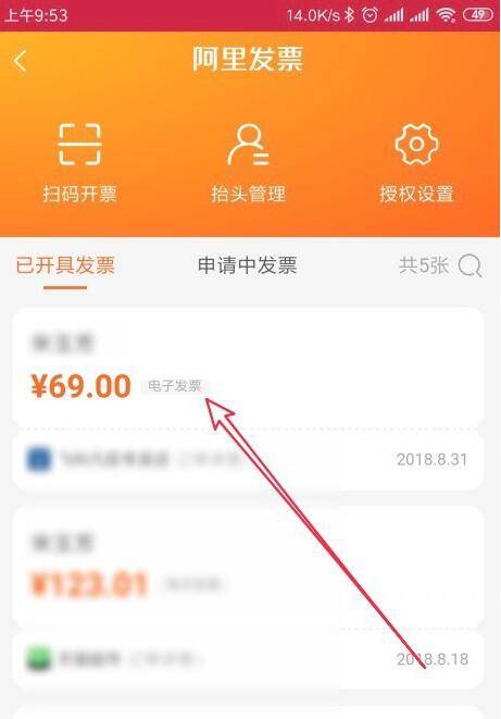 然后在打开的阿里发票的页面中可以看到所有的发票的列表,点击其中一个发票链接。