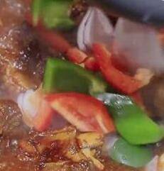 4、大火收汁20分钟左右,加入切好的彩椒和洋葱块,进行翻炒均匀即可。