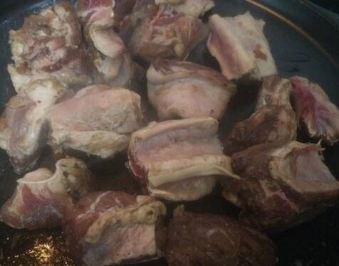 3、牛肋排煎至两面金黄,加老抽少许,料酒适量,加水没过食材。