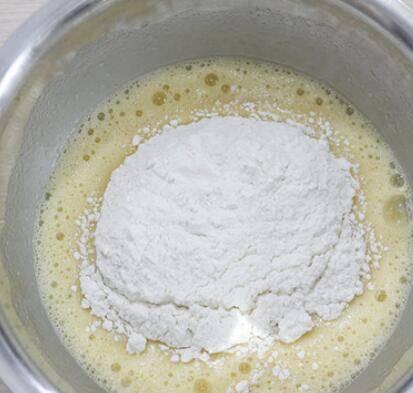 4、再将面粉筛入后搅拌均匀,3个蛋清倒入打蛋盆中,滴几滴柠檬汁。