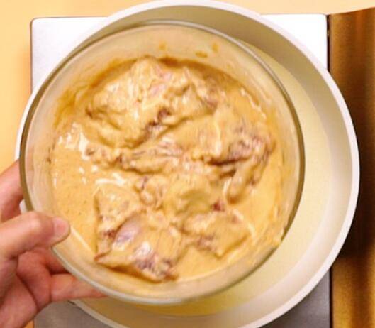2、放入排骨,倒入香脆炸鸡粉、料酒、清水,抓匀腌制1小时。