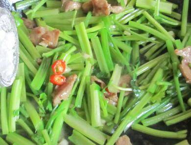 5、翻炒5分钟左右时加入盐等调味, 最后翻炒均匀即可。