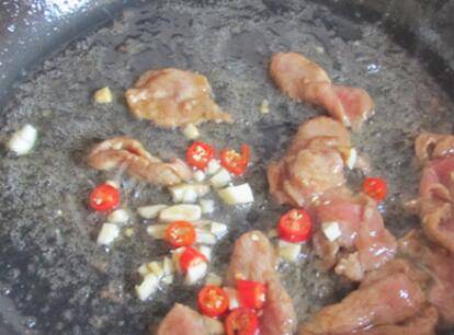 3、热锅凉油, 放入腌制好的鸭脯肉翻炒,放蒜粒和红椒圈翻炒。