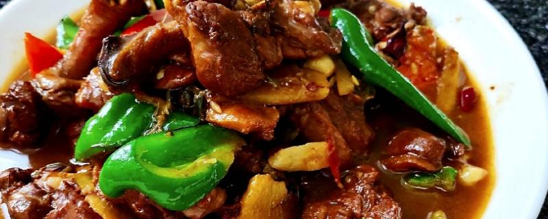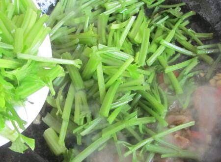 4、下鸭肉大火炒至鸭肉变色,放辣椒、盐翻炒2分钟即可。