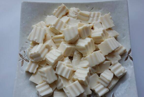 3、豆腐都出来切方块装盘。
