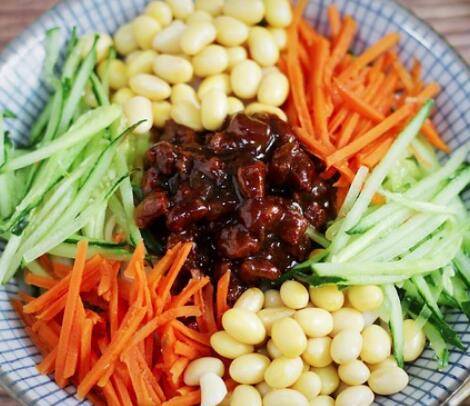3、锅中倒油,下肉末炒熟,加入黄豆酱、料酒、糖、大葱翻拌均匀。