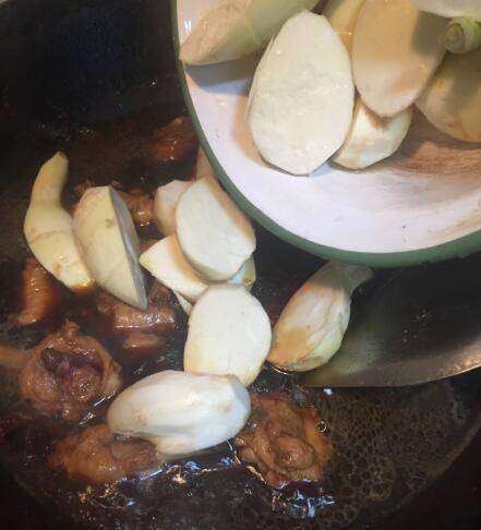 6、10分钟后倒入茨菇翻炒加入冰糖继续烧煮,烧开后转小火。