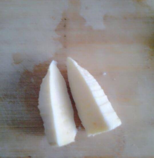 2、大一点的笋,一般是竖着从中间切一刀,然后再把一半的冬笋竖着切成薄片,一般切的厚度为2-3mm。
