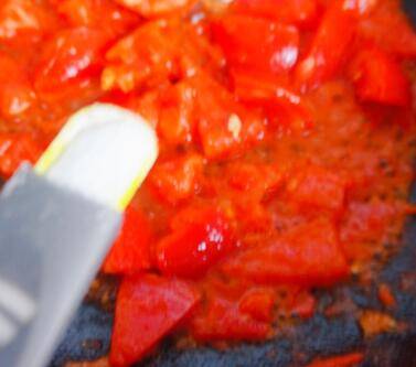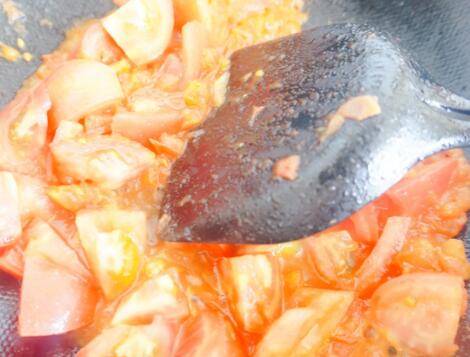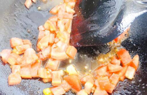 先将锅中剩余的油加热,放入西红柿丁翻炒,炒的时候用刀背按一下,熬至出蓉。