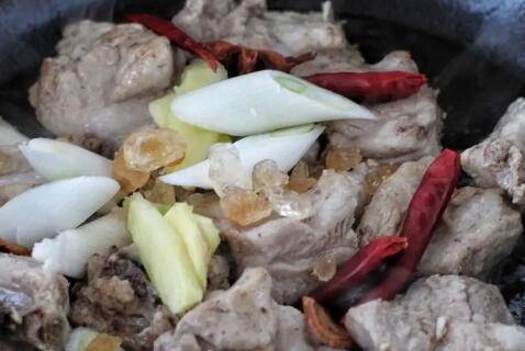 然后放葱、姜、八角、桂皮、红干椒和冰糖,翻炒至冰糖融化。