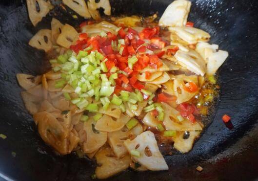 烧几分钟、因为藕含淀粉比较多如果锅里汤汁比较少可以适当加一点儿水,别加多了。青红椒丁下锅炒匀,淋入少许香油就可以了。