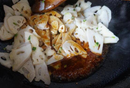下藕片翻炒,调好的料汁倒进锅里翻炒均匀。