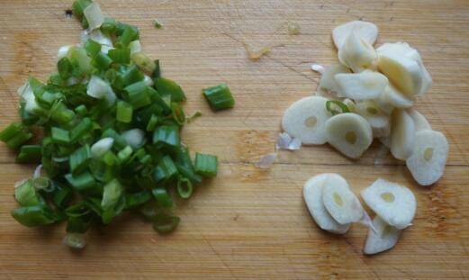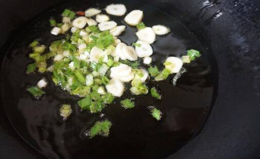 油烧至五成热下葱、蒜片炒出香味儿。
