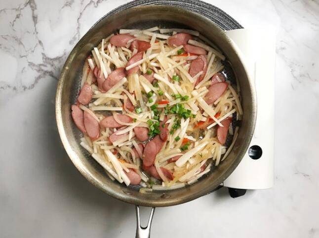 4、翻炒出香味后加入白萝卜丝进去翻炒。