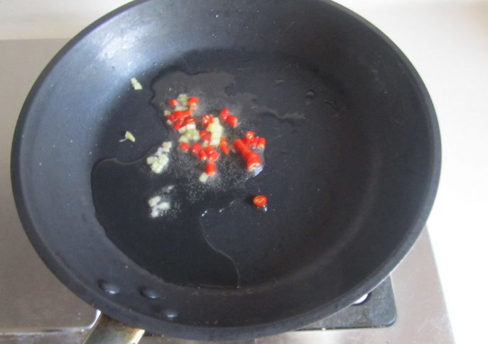 2、热锅凉油,下入红椒末和姜末爆香。