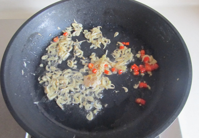3、再加入虾皮进去翻炒。