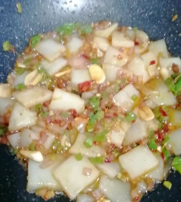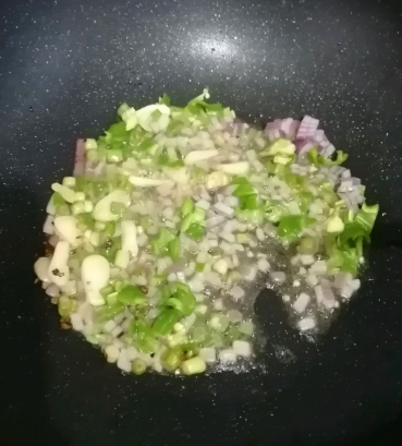 起锅热油,放入洋葱、辣椒、葱花以及蒜片炒出香味。