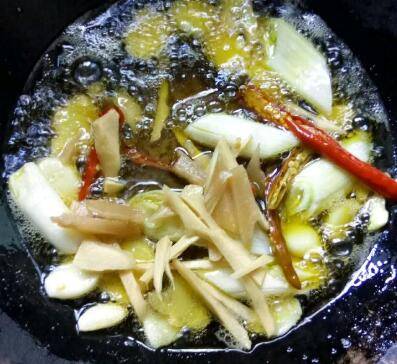 锅中放葱姜蒜小火炒香,加泡姜、泡海椒炒香。