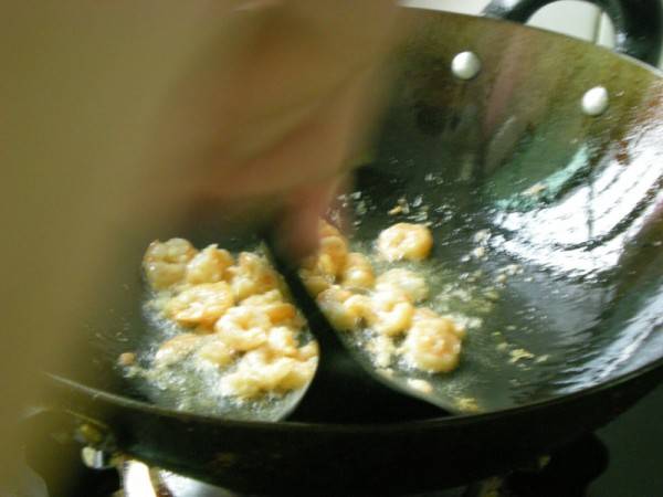 4、锅里热油,将虾仁翻炒1分钟盛出备用。