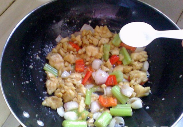 5、加入鸡脯肉、盐翻炒均匀,加鸡粉、白糖炒匀即可。