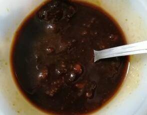 3、甜面酱、黄豆酱、生抽、老抽、糖、清水调成汁酱。
