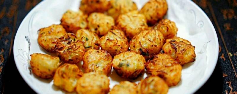 放食用油,油温七成热下锅炸。炸至金黄色即可捞出。 用大拇指与食指间的虎口挤出球形生面团丸子,直接下锅炸。