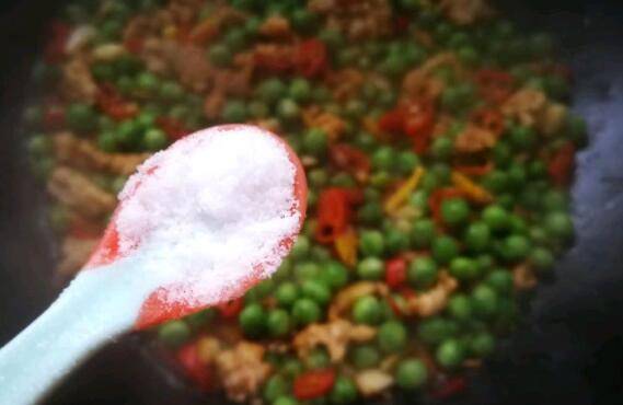 倒入辣椒和姜蒜爆香,倒入焯水后的豌豆大火快速翻炒。