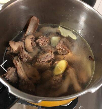 将炒干的鸭肉放入高压锅,加姜片,加水,没过鸭肉,压20分钟。