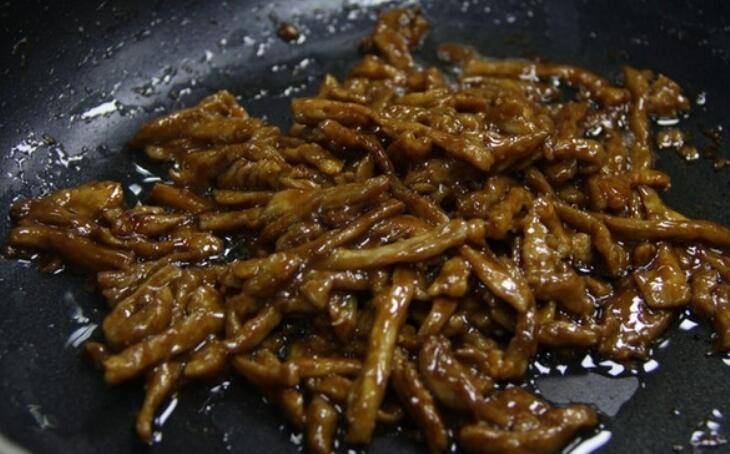 9.锅里放入适量的花生油,把前面腌制好的瘦肉丝倒入锅中,翻炒。