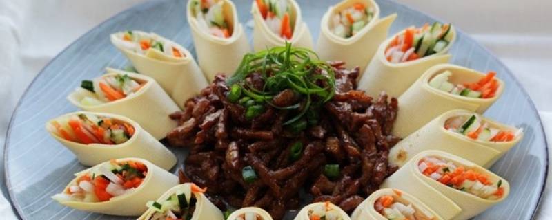 用料:瘦肉250克、大葱一根、胡萝卜半根、青瓜豆腐皮两张、盐适量、花生油适量、生抽5毫升、甜面酱10克、生粉5克、蚝油5克。
