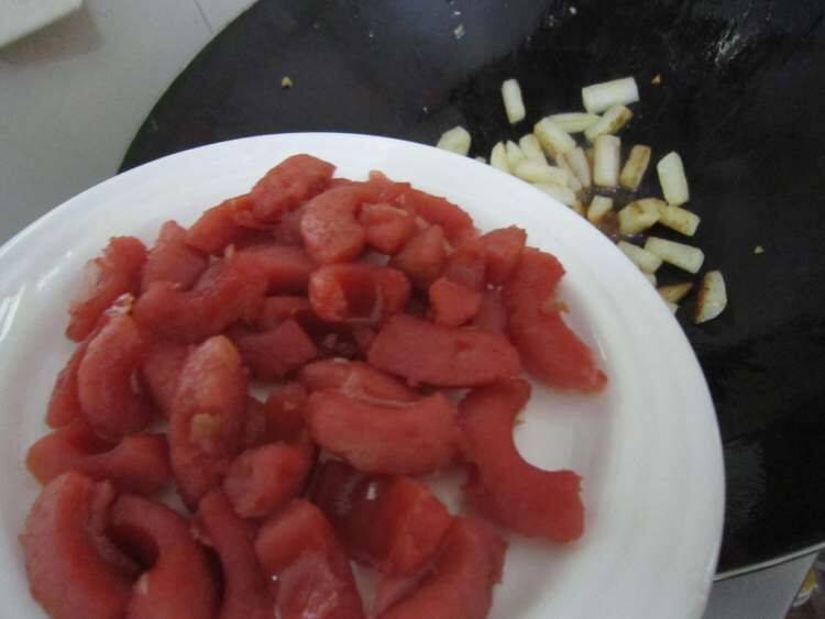 3、热油锅把香肠下锅煸炒至表面焦黄时取出备用。