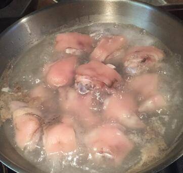 2、冷水下锅,水开出锅,目的是要把猪蹄里面的脏东西煮出来。