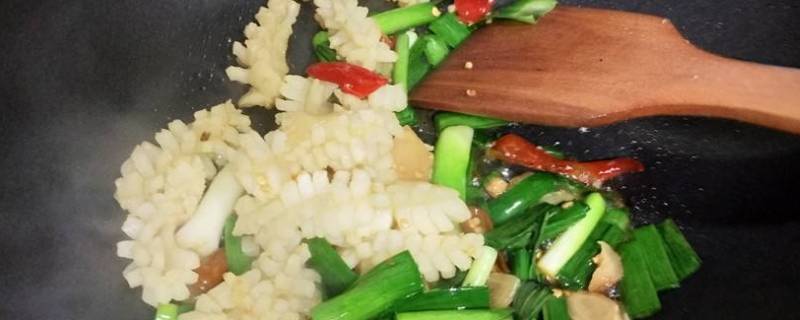 7、炒出香味,鱿鱼入锅炒。