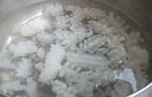 4、鱿鱼花入锅焯水后捞出沥干水。