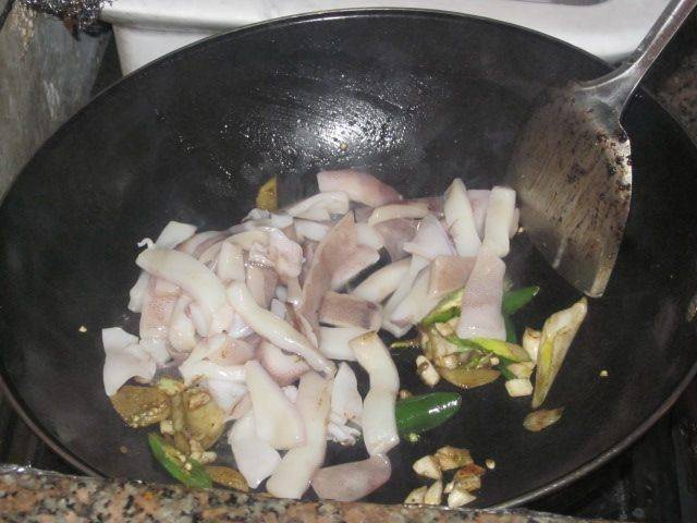 4、倒入鱿鱼,加适量料酒、生抽、香菜,大火翻炒。