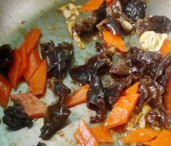 6、倒入木耳和胡萝卜片翻炒一会儿。