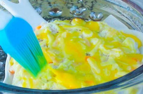 碗底铺一层油纸,银鱼蔬菜面糊倒入。