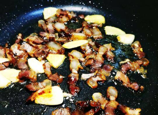 锅里放油,把蒜头、姜爆香,放腊肉下锅翻炒出油。