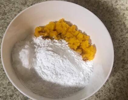 将南瓜泥装在碗里,趁热加糯米粉。