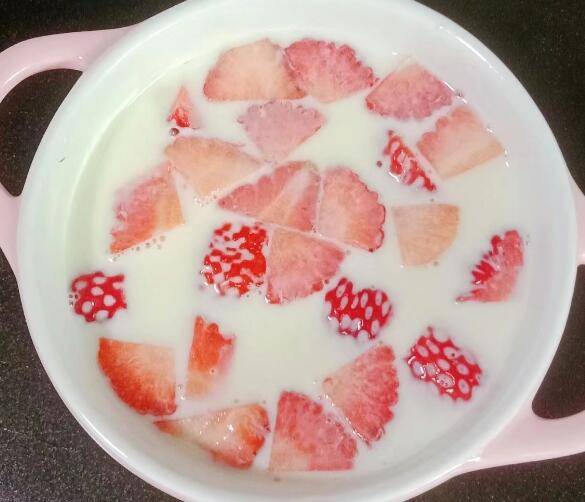 6、将牛奶液倒入装有草莓的碗中,放入冰箱冷藏四小时以上即可享用。