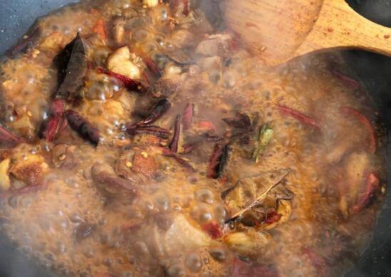 爆炒葱姜蒜香料,然后放入干辣椒和豆瓣酱小火煸香。