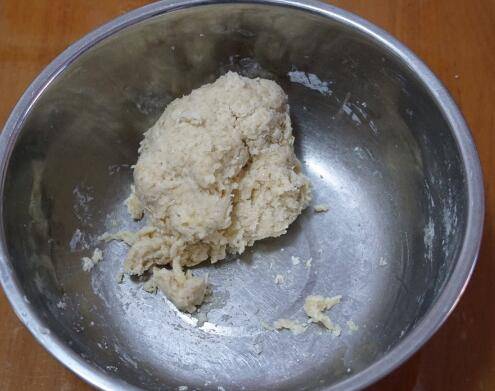 2、倒入纯牛奶,用手揉成一个面团后取出放台面上,用双手揉成稍光滑的面团。