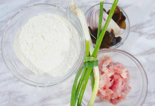 用料:中筋面粉120克、猪肉馅适量、洋葱1小块、木耳2-3朵、香葱1根。