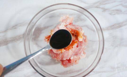 4、猪肉馅里倒入1勺酱油、1勺香油,顺时针方向搅拌。
